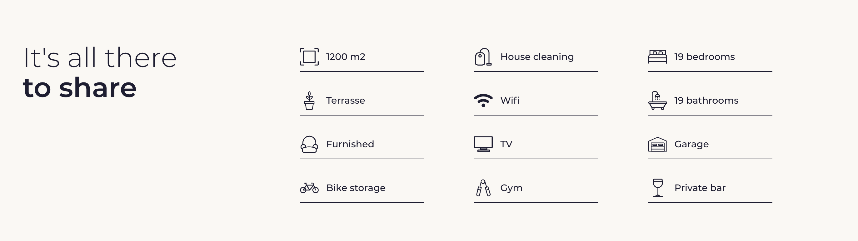 Une partie de la maison serait dédiée à la vie en communauté comme dans une colocation classique : création de chambres thématiques (Elon, Bill, Jeff,...), cuisine partagée (photos de chefs inspirants), des espaces communs inspirés des startups, une salle de sport,...
