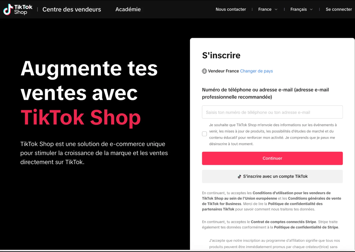 Vous pouvez créer votre boutique TikTok Shop via ce lien et ensuite suivre les écrans classiques de création d'un compte.
